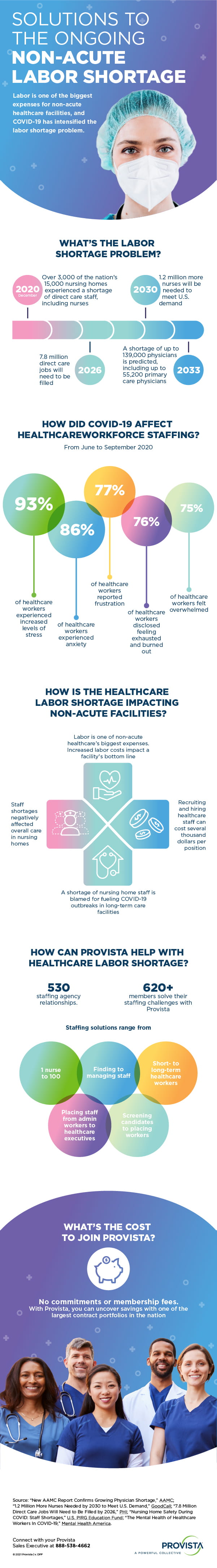 The healthcare workforce is not large enough to meet current and future demand. The COVID-19 pandemic is partially to blame. This infographic highlights the labor issue and how Provista helps solve the problem.